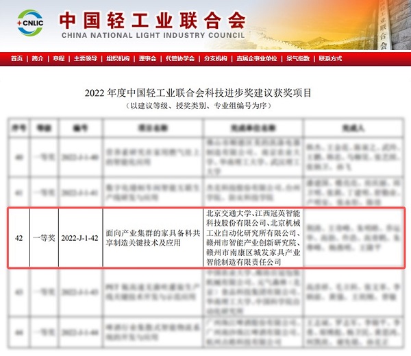 近日,中國輕工業(yè)聯(lián)合會在官網(wǎng)發(fā)布了經(jīng)評審通過的“2022年度中國輕工業(yè)聯(lián)合會科學技術獎建議獲獎項目”名單。北京機械工業(yè)自動化研究所有限公司(簡稱北自所)參與完成的《面向產(chǎn)業(yè)集群的家具備料共享制造關鍵技術與應用》項目,榮獲2022年度中國輕工業(yè)聯(lián)合會科技進步一等獎。