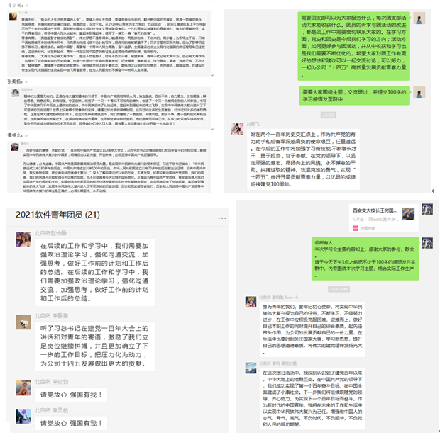 廣大團員紛紛表示,通過學(xué)習(xí)領(lǐng)會習(xí)近平總書記“七一”講話精神,深刻認識到正是在黨的領(lǐng)導(dǎo)下,我們國家和民族才取得了一系列偉大成就,表明將始終堅持和擁護黨的領(lǐng)導(dǎo);充分理解黨百年來帶領(lǐng)人民獲得民族獨立、謀求民族復(fù)興道路的不易,表示將牢記歷史,珍惜當下的幸福生活。同時,團員青年結(jié)合自身工作實際,從業(yè)務(wù)或管理角度,對自身如何北自所“十四五”高質(zhì)量發(fā)展貢獻青春力量進行了交流研討,大家指出,作為新時代青年,要努力為實現(xiàn)中華民族偉大復(fù)興貢獻力量,堅定信念目標、矢志艱苦奮斗,在工作崗位上踏實奉獻、鍛煉自我,在公司“十四五”發(fā)展的重要機遇期把握機會、努力提升、爭創(chuàng)佳績。